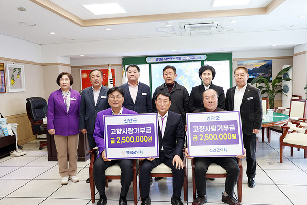 영광군의회(의장 김강헌)와 신안군의회(의장 이상주)는 지난 7일, 신안군의회 의장실에서 고향사랑기부금 상호 전달식을 하고 지역 간 상생과 연대의 의지를 다졌다.