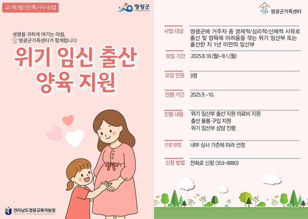 영광군가족센터는 영광교육지원청 지원으로 ‘교육특구발전사업-위기임신출산 양육지원’ 프로그램을 시행한다. 영광군 관내 위기임산부 대상으로, 내부 심사를 거쳐 대상자 선정 후 출산 의료비 지원, 출산 물품 구입 지원, 위기 임산부 상담을 진행한다. 진행 기간은 2025년 9월부터 10월까지다.
