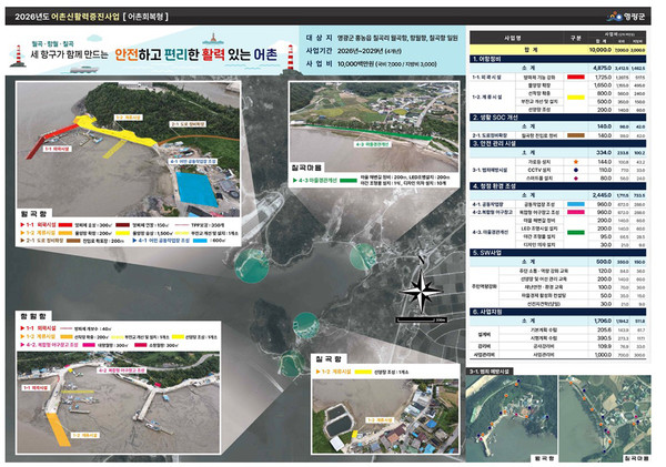 주요 사업내용은 방파제 및 물양장 확보, 부잔교 설치, 어구창고 신설 등 어촌의 생활 인프라 확충과 안전성 강화를 위한 사업이 추진될 예정이다.